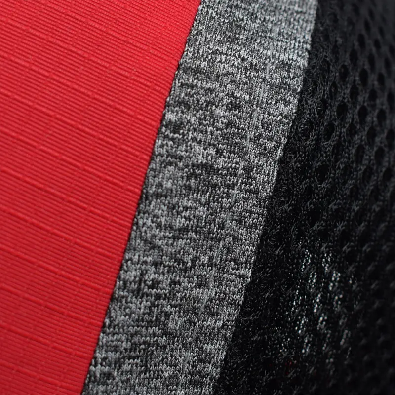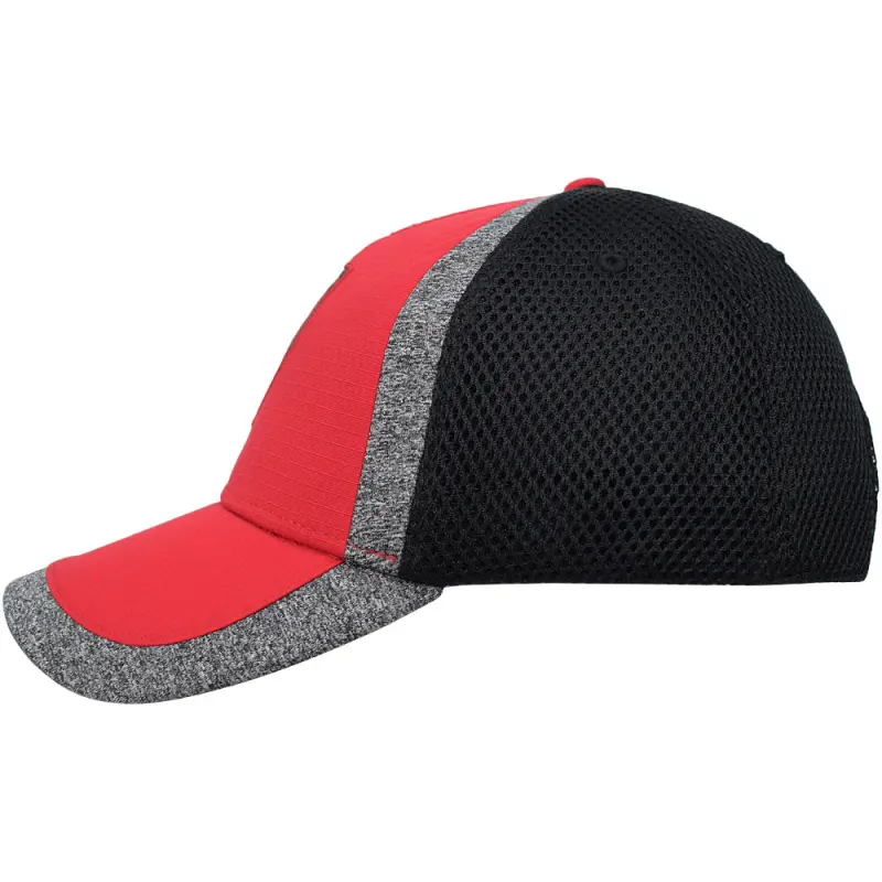 - Red and grey marl crown and peak with black mesh read panels