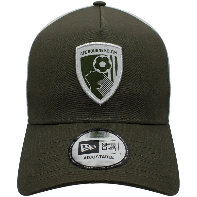 AFC Bournemouth have teamed up with headwear brand New Era to create this smart adult’s fit two-tone olive and white A-Frame trucker hat. Featuring a classic trucker style, with cotton crown and mesh back panels, the cap has a pre curved peak and snapback for a secure and comfortable fit, and is finished with a tonal embroidered club crest on the crown, and New Era flag embroidery on the side.