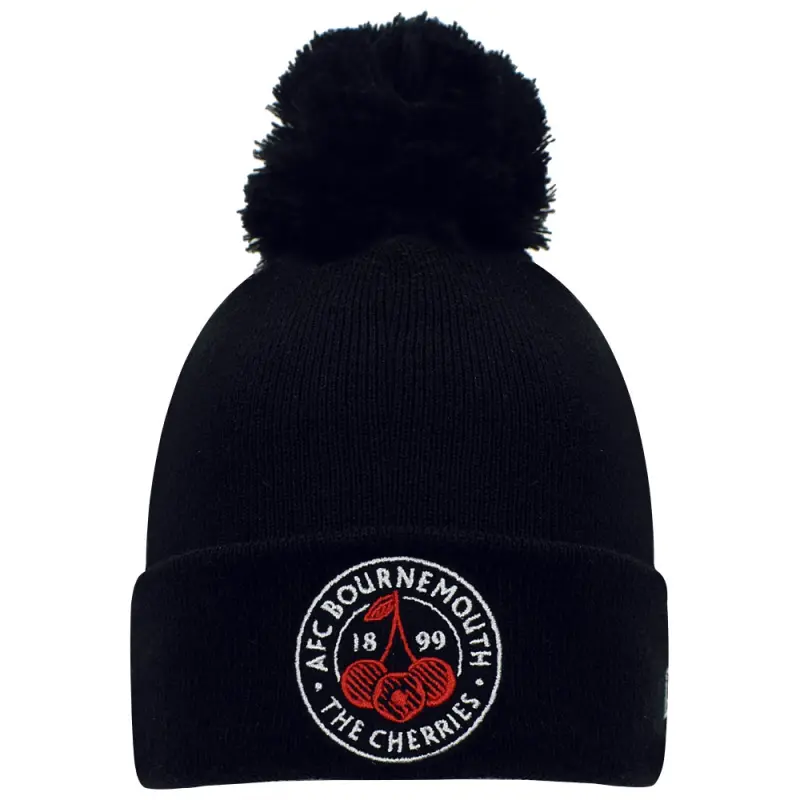 This cool adult’s fit AFC Bournemouth New Era Cherries Crest bobble hat is ideal for showing your support in the cooler weather. The knitted ski hat features a turnover cuff topped off with a classic bobble and fits most adults. Finished with an embroidered Cherries crest on the crown, and white embroidered New Era flag on the side.