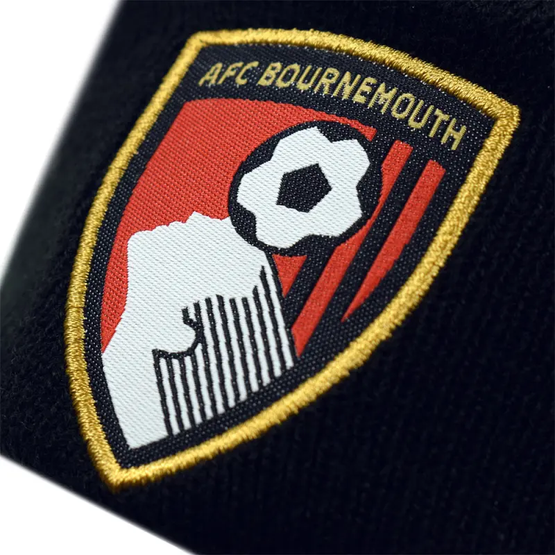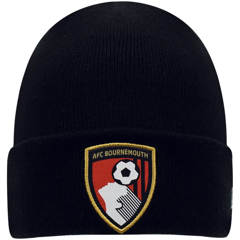 This classic black adult’s fit AFC Bournemouth New Era beanie hat is perfect for everyday wear while showing your support for the club. The comfortable knitted beanie features a turnover cuff and fits most adults. Finished with a full colour embroidered club crest on the crown, and white embroidered New Era flag on the side.