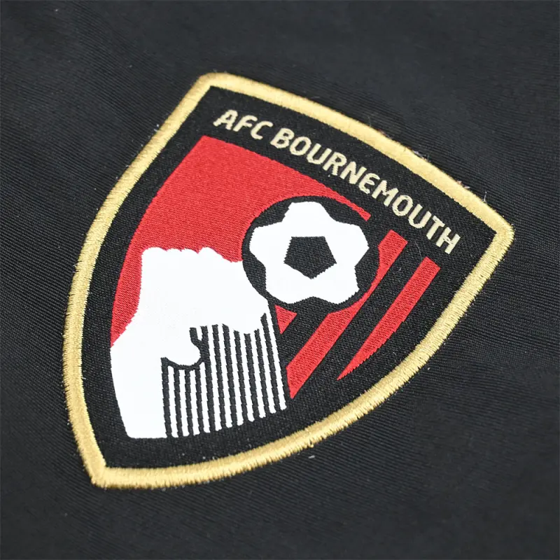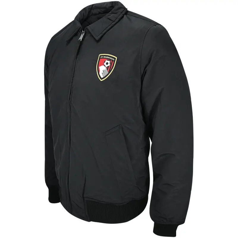 Show your support in style with the AFC Bournemouth Adults Berkeley Jacket in sleek black. Designed in a smart bomber style, this regular fit jacket features a durable nylon outer with cosy polyester padding and quilted lining to keep you warm. The tipped turn-down collar, ribbed cuffs and waist, along with a sturdy metal zip and two practical hand pockets, add classic bomber detailing. Finished with the full colour woven club crest on the chest, this versatile jacket is perfect for AFCB supporters who want a smart, everyday layer with a touch of club pride.