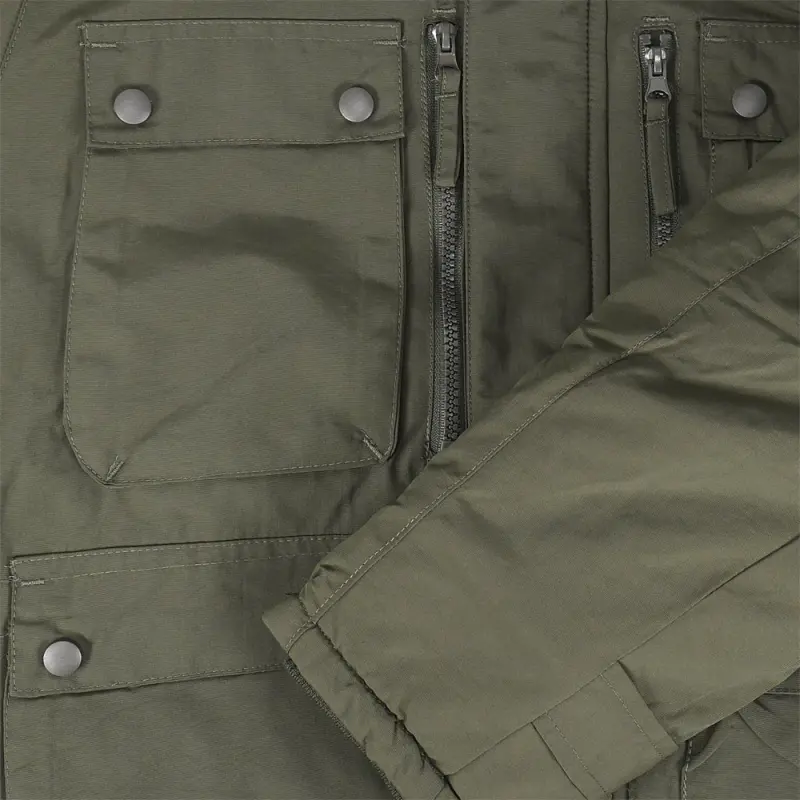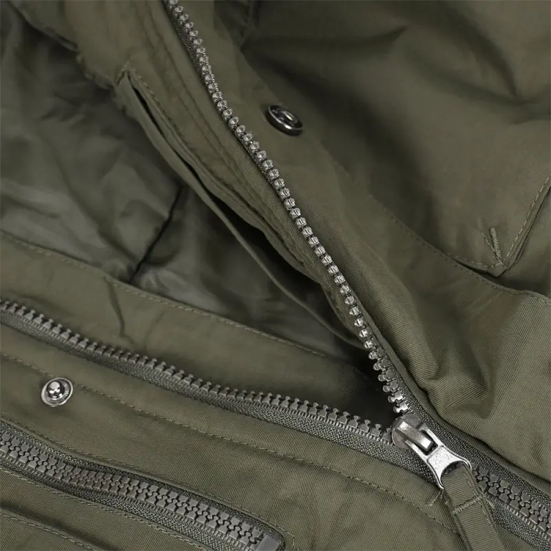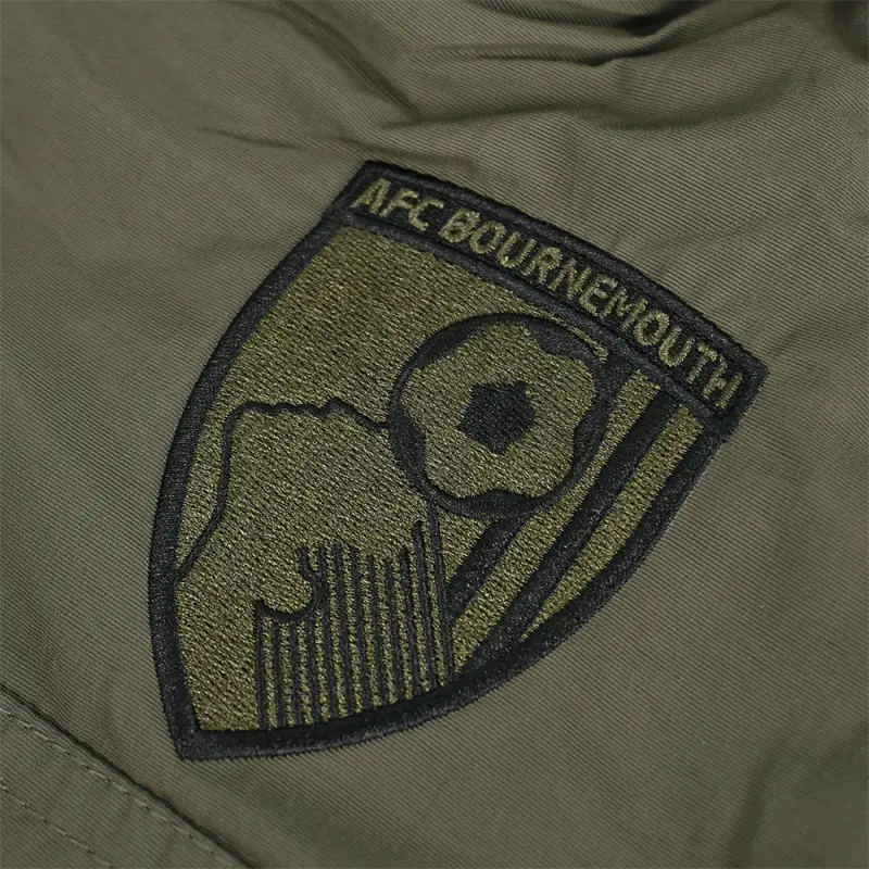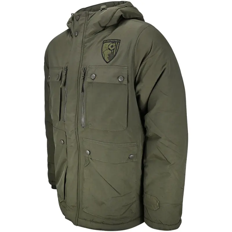 Stay warm and comfortable through the colder months with the AFC Bournemouth adult’s Columbus coat in khaki. Designed for everyday wear, this regular-fit long jacket combines practicality and style with its durable nylon outer and soft polyester padding and lining. The coat features a chunky full-length zip with a popper-down storm flap to keep out the chill, along with ribbed cuffs for a snug finish. Multiple storage options include four front cargo-style pockets, two zipped breast pockets, and an inside pocket for essentials. The warm padded hood with an adjustable fit adds extra protection against the elements, while the tonal woven club crest offers a subtle nod to your support for the Cherries.