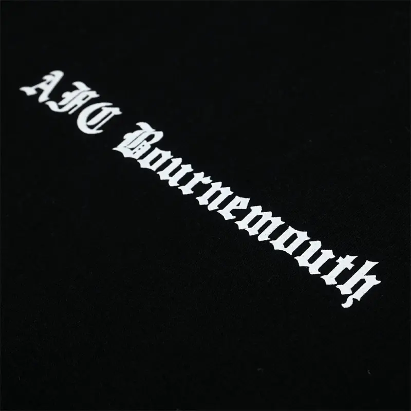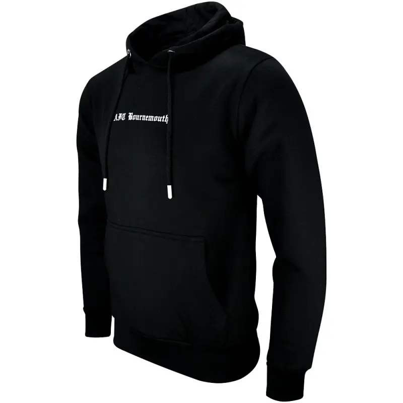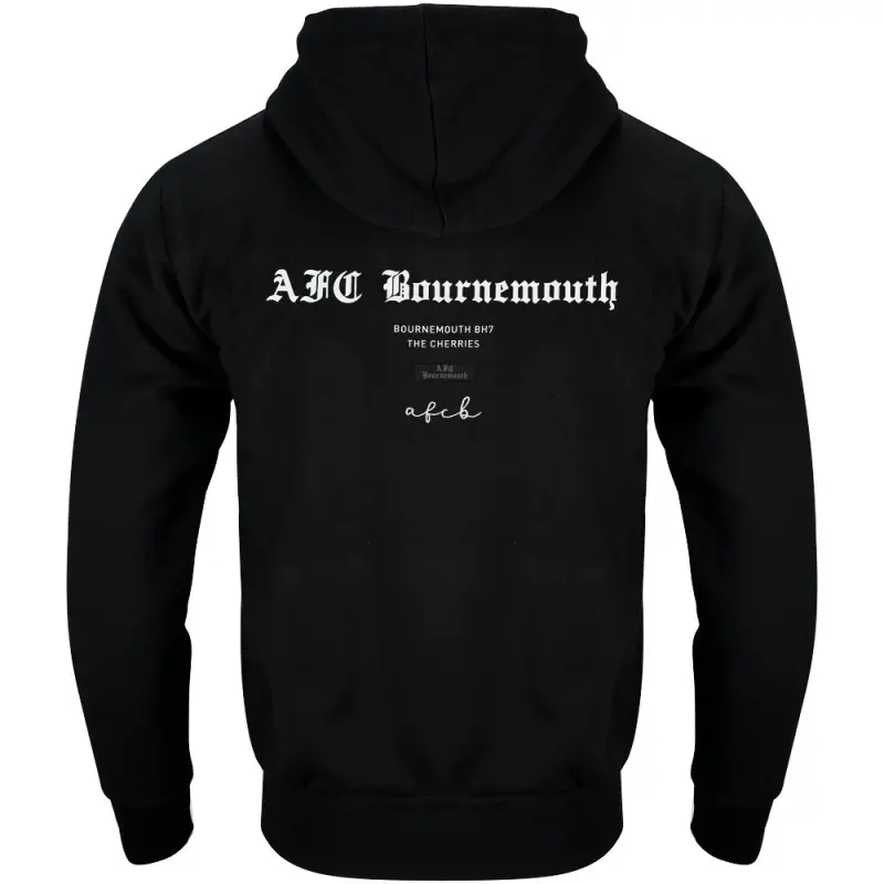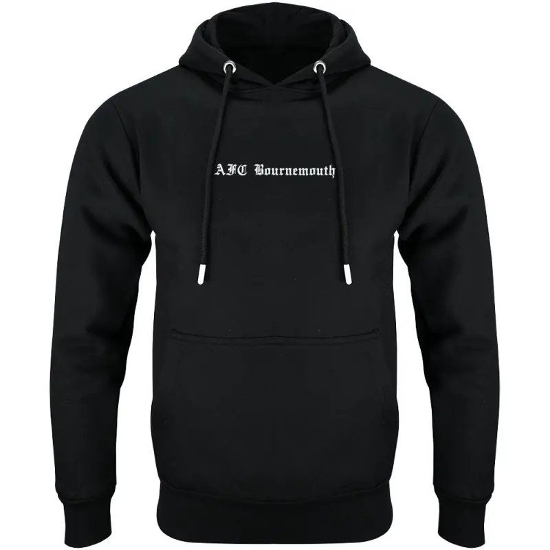This AFC Bournemouth Adults Gladstone Hoodie in black combines classic streetwear style with true Cherries identity, making it a must-have for any supporter. Made from a soft cotton and polyester blend with a warm fleece lining, the regular-fit hoodie features a jersey-lined hood with adjustable drawstrings and a practical marsupial pouch pocket for everyday comfort. Finished with bold white Old English text on the front and back, a large statement graphic on the reverse, and AFCB embroidery with an applique patch, it delivers a striking look that proudly showcases your support for the club.