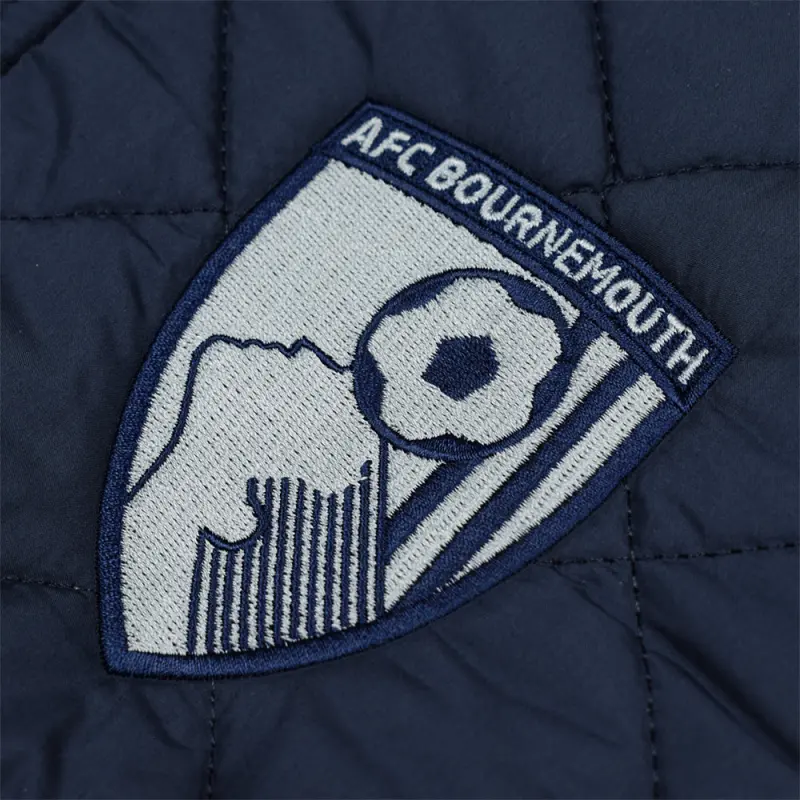 This navy blue AFC Bournemouth adult’s jacket has a smart style, with diamond quilting and popper fastened storm flap. The premium Gorley jacket has generous padding for added warmth and a soft cotton lining. There’s a full length nylon zip and two hand pockets with secure flaps, and the jacket is finished with a tonal embroidered club crest.