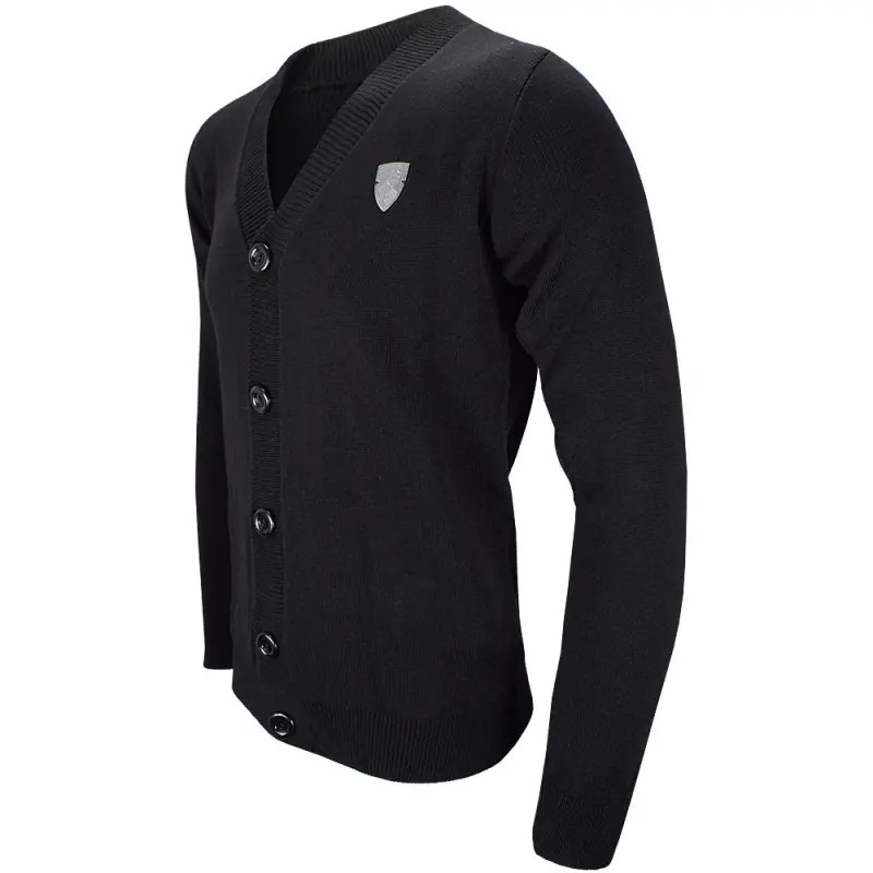 Enhance your everyday wear with this classic and modern black AFC Bournemouth cardigan. Its premium look and feel, featuring a deep neckline and ribbed trim, is elevated by five chunky buttons and a chrome club crest. Crafted from high-quality knitted acrylic, this regular fit Grove cardigan is suitable for both men and women.