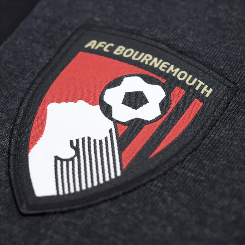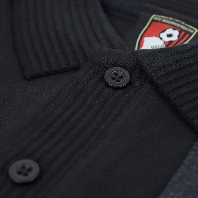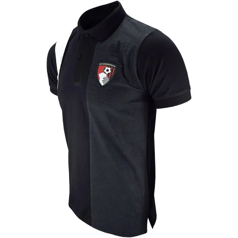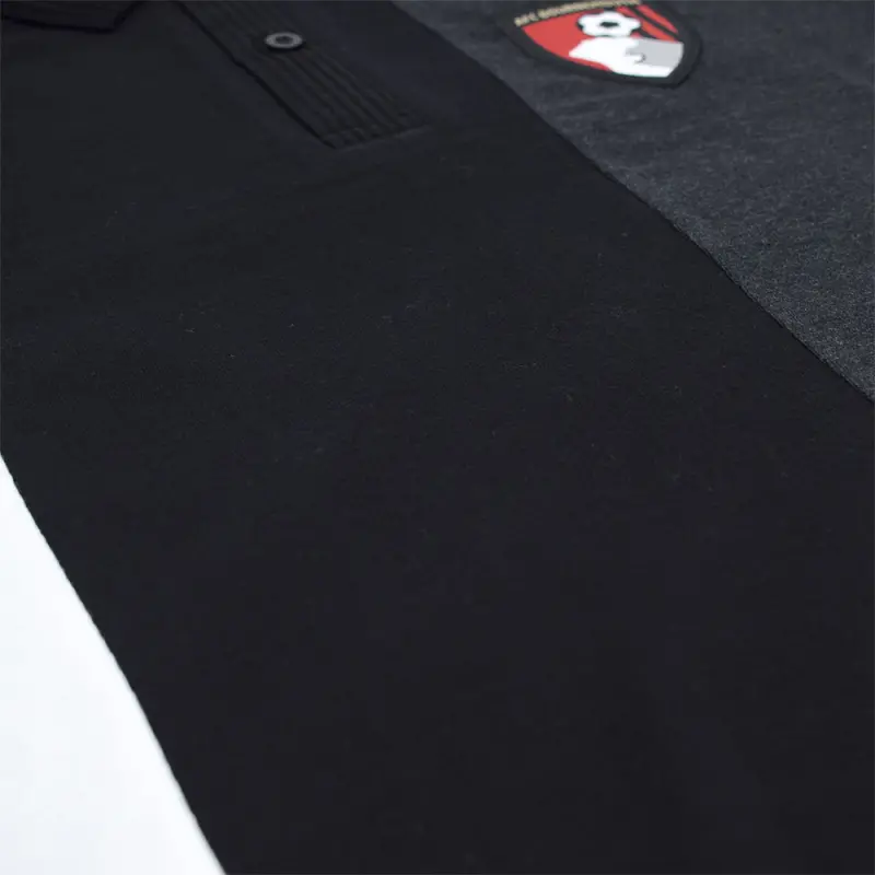 This AFC Bournemouth adult’s polo shirt has standout style, with a three colour vertical panelling for a unique look. The Harmon polo shirt is made from soft cotton and features a mainly black body, with white and grey marl panels, completed by an embroidered applique club crest on the chest. Regular fitting.
