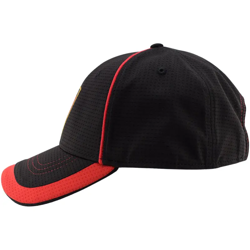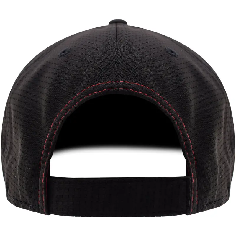 - Curved peak with red trim