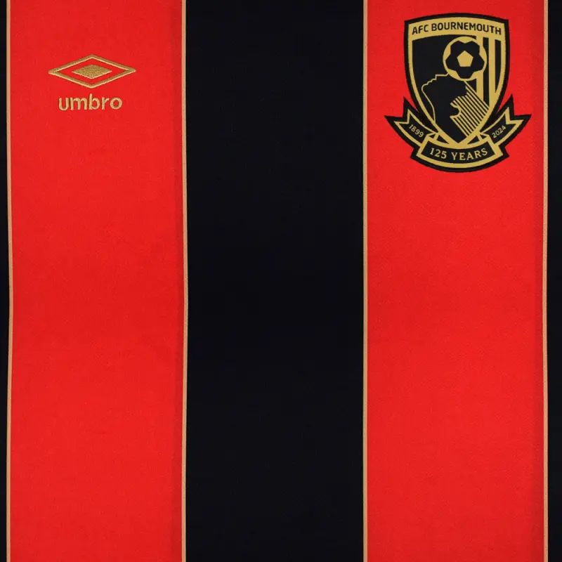This limited edition version of the AFC Bournemouth 2024-25 home shirt celebrates the club’s 125 year anniversary, with a nod to the 10th anniversary of our first promotion to the Premier League. This youth home shirt features wide red and black stripes, with a subtle gold pinstripe in homage to the 14/15 season kit, and a special 1899-2024 motif on the rear neckline. Made by kit supplier Umbro, the shirt is identical to the shirts worn by the first team players. Finished with a special embroidered Umbro centenary stacked diamond, and woven club crest.