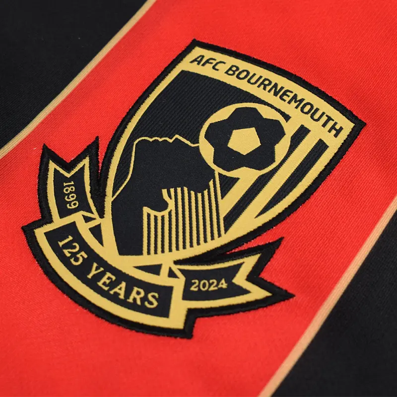 This limited edition version of the AFC Bournemouth 2024-25 home shirt celebrates the club’s 125 year anniversary, with a nod to the 10th anniversary of our first promotion to the Premier League. This youth home shirt features wide red and black stripes, with a subtle gold pinstripe in homage to the 14/15 season kit, and a special 1899-2024 motif on the rear neckline. Made by kit supplier Umbro, the shirt is identical to the shirts worn by the first team players. Finished with a special embroidered Umbro centenary stacked diamond, and woven club crest.