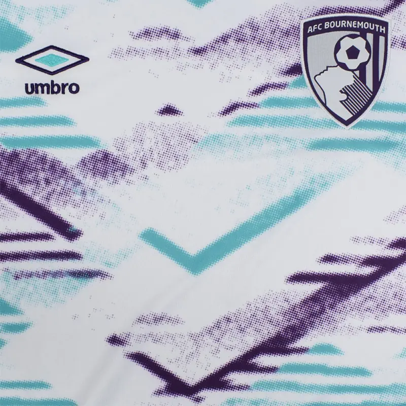 AFC Bournemouth’s away shirt for the 2024-25 Premier League season draw’s it’s inspiration from the famous ‘Pizza Shirt’ worn by the club between 1992-94. Made by kit supplier Umbro, this youth’s unsponsored away shirt features a green and purple chevron design on the front, with pops of purple on the neck and sleeves, and green AFCB initialling on the rear neckline. The shirt is identical to the jersey which will be worn by the first team players, and is finished with Umbro’s embroidered centenary stacked diamond motif, alongside the AFC Bournemouth club crest. Suitable for boys and girls.