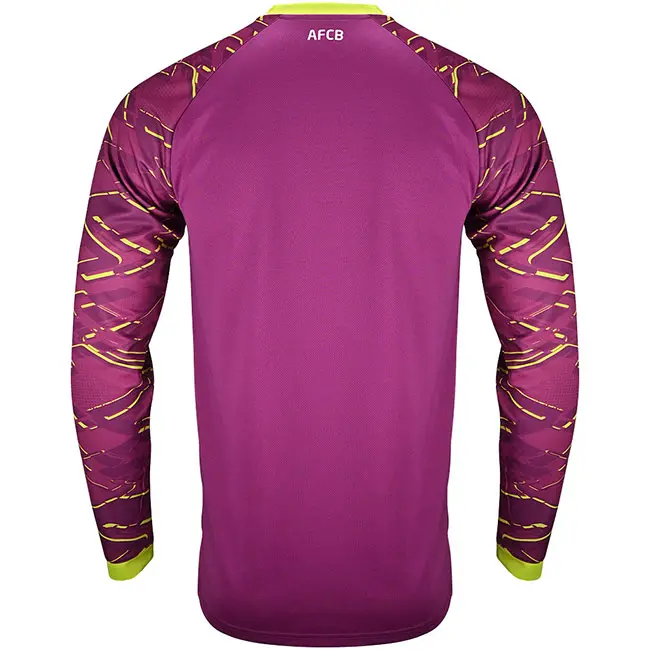 Let your young shot-stopper stand out in style with this 25/26 AFC Bournemouth children’s goalkeeper shirt. Featuring a striking Wild Aster purple colourway with Acid Lime trim on the neckline and sleeves, this authentic match specification jersey mirrors the kit worn by the team. With long sleeves showcasing an abstract Umbro logo pattern, and premium details like the woven club crest and embroidered Umbro stacked diamond, it’s perfect for both boys and girls.