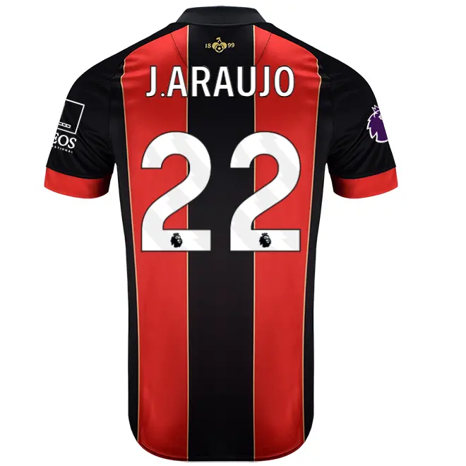 The AFC Bournemouth 2024-25 home shirt celebrates the club’s 125 year anniversary, with a nod to the 10th anniversary of our first promotion to the Premier League. This youth home shirt features wide red and black stripes, with a subtle gold pinstripe in homage to the 14/15 season kit, and a special 1899-2024 motif on the rear neckline. Made by kit supplier Umbro, the shirt is identical to the shirts worn by the first team players. Finished with a special embroidered Umbro centenary stacked diamond, and woven club crest.