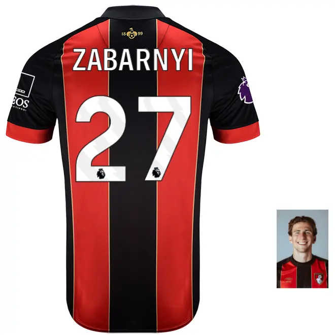 The AFC Bournemouth 2024-25 home shirt celebrates the club’s 125 year anniversary, with a nod to the 10th anniversary of our first promotion to the Premier League. This youth home shirt features wide red and black stripes, with a subtle gold pinstripe in homage to the 14/15 season kit, and a special 1899-2024 motif on the rear neckline. Made by kit supplier Umbro, the shirt is identical to the shirts worn by the first team players. Finished with a special embroidered Umbro centenary stacked diamond, and woven club crest.