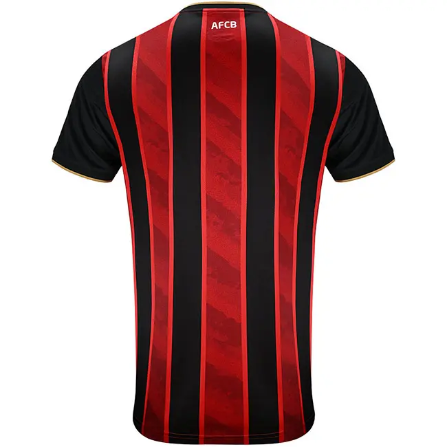 Inspire young fans to show their passion for the Cherries with the AFC Bournemouth Children’s Home Shirt 25/26. This official kids’ jersey mirrors the authentic match-day design worn by the players, featuring the bold red and black ‘rippled sand’ inspired stripes for a unique and modern look. The gold trim on the sleeves and collar adds a premium touch, while the embroidered club crest and Umbro stacked diamond logo proudly display club identity.