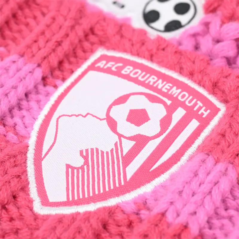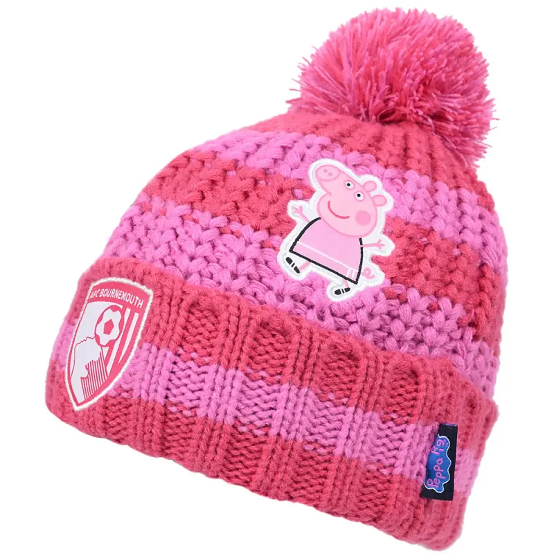 The AFC Bournemouth Kids Peppa Beanie in pink is a cheerful and cosy hat, perfect for young supporters who enjoy Peppa Pig. Crafted from soft acrylic, it features two-tone pink hoops on the crown, a playful bobble top, and a turnover cuff with the embroidered club crest. Completed with a woven patch of Peppa and George, and a warm polar fleece lining, this exclusive design adds a fun and supportive touch to colder days.