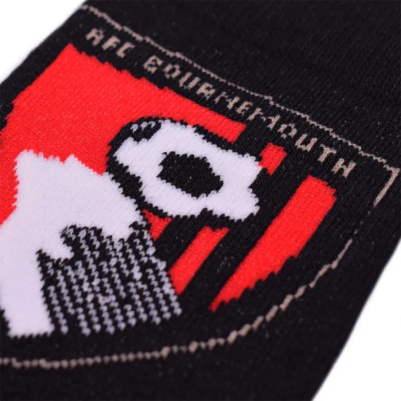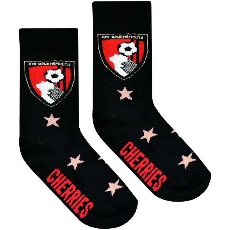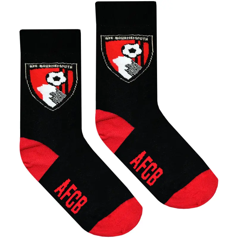 These kid’s AFC Bournemouth socks will make an ideal gift for any young Cherries supporter. The socks are made from soft mixed fibres, with one pair featuring a football design, and the other featuring the club’s classic red and black stripes. Finished with the Cherries iconic crest on both pairs. Suitable for shoe sizes from 12-5 UK.