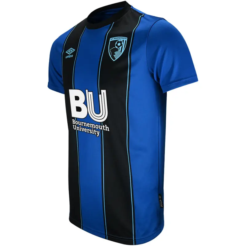 Gear up for the 2025/26 season with the official AFC Bournemouth men’s away shirt, featuring a striking blue and black design inspired by classic kits from the club’s history. This authentic match-specification jersey showcases subtle aqua pinstripe detailing and an embroidered aqua club crest, paired with Umbro’s iconic stacked diamond logo for a premium look. Regular fitting, it offers a comfortable and stylish way to show your support for the Cherries, both on match day and beyond.