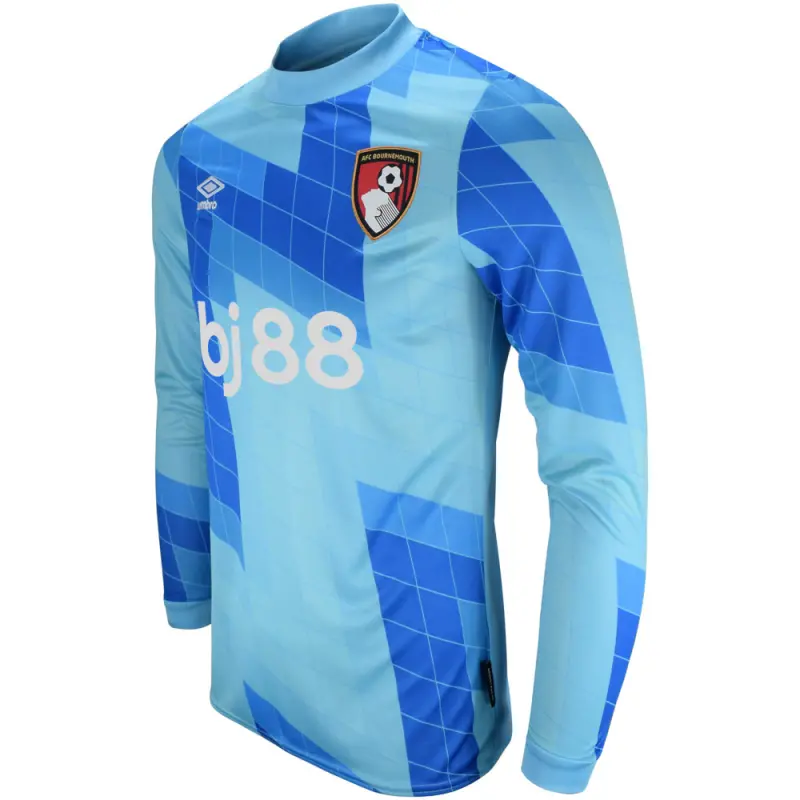 This men’s 2024/25 AFC Bournemouth goalkeeper shirt has a bold design, finished in blue, with a tonal diamond zig-zag pattern on the front. The long sleeved top is identical to the jerseys worn by the Cherries’ shot-stoppers this season, and is made from moisture wicking material for comfort, with ribbed collar and cuffs, and AFCB initialling on the rear neckline. Finished with the BJ88 sponsor’s logo on the chest, alongside Umbro’s centenary stacked diamond motif, and the Cherries embroidered club crest.