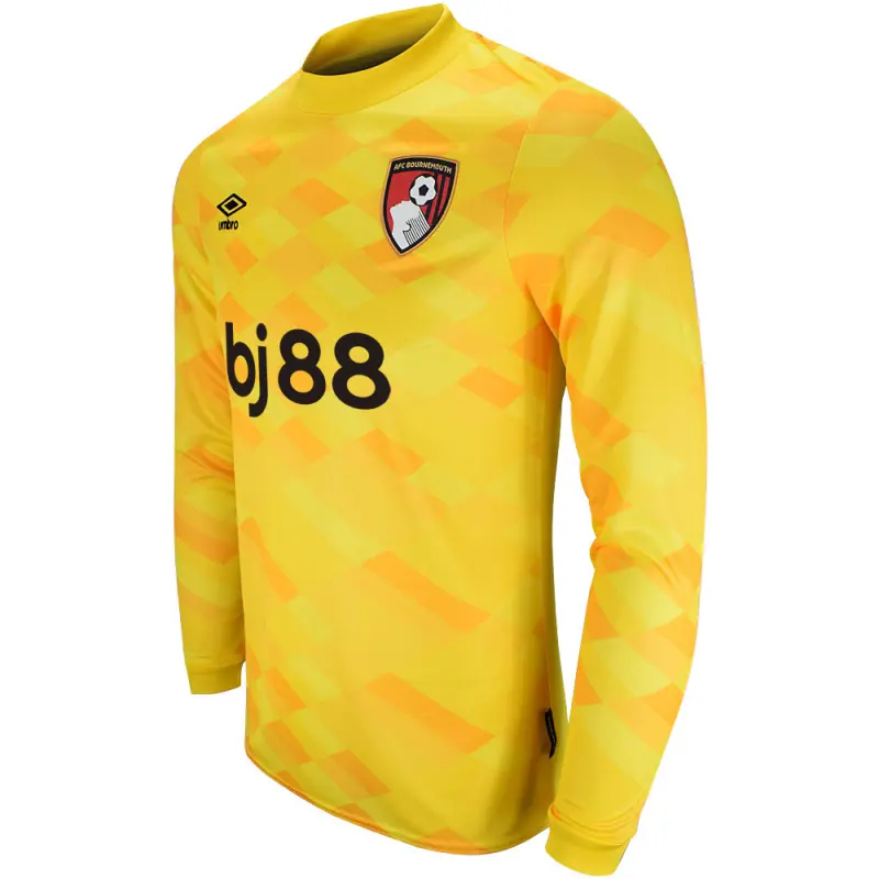 This men’s 2024/25 AFC Bournemouth goalkeeper shirt has a bold design, finished in bright yellow, with a tonal diamond pattern on the front. The long sleeved top is identical to the jerseys worn by the Cherries’ shot-stoppers this season, and is made from moisture wicking material for comfort, with ribbed collar and cuffs, and AFCB initialling on the rear neckline. Finished with the BJ88 sponsor’s logo on the chest, alongside Umbro’s centenary stacked diamond motif, and the Cherries embroidered club crest.