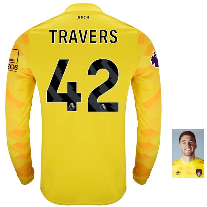 This men’s 2024/25 AFC Bournemouth goalkeeper shirt has a bold design, finished in bright yellow, with a tonal diamond pattern on the front. The long sleeved top is identical to the jerseys worn by the Cherries’ shot-stoppers this season, and is made from moisture wicking material for comfort, with ribbed collar and cuffs, and AFCB initialling on the rear neckline. Finished with the BJ88 sponsor’s logo on the chest, alongside Umbro’s centenary stacked diamond motif, and the Cherries embroidered club crest.