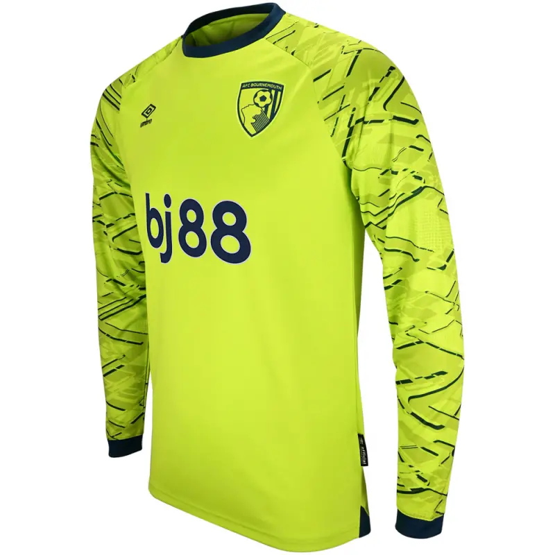 Stand tall in this 25/26 AFC Bournemouth men’s goalkeeper shirt. Crafted in a bold Acid Lime colourway with Majolica Blue trim on the neckline and sleeves, this eye-catching jersey ensures you’ll command attention on the pitch. Featuring long sleeves adorned with an abstract Umbro logo pattern, it’s built to authentic match specifications and finished with a woven full-colour club crest and embroidered Umbro stacked diamond for a premium look.
