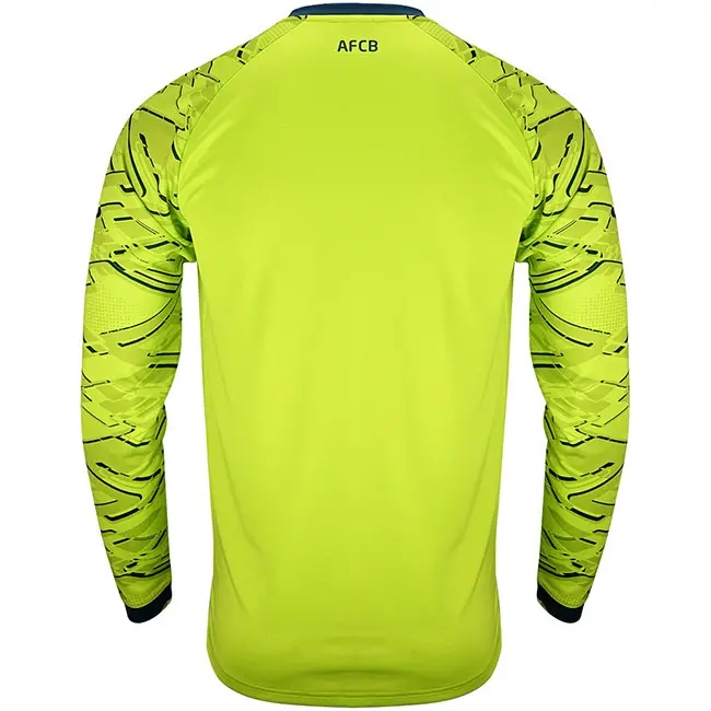 Stand tall in this 25/26 AFC Bournemouth men’s goalkeeper shirt. Crafted in a bold Acid Lime colourway with Majolica Blue trim on the neckline and sleeves, this eye-catching jersey ensures you’ll command attention on the pitch. Featuring long sleeves adorned with an abstract Umbro logo pattern, it’s built to authentic match specifications and finished with a woven full-colour club crest and embroidered Umbro stacked diamond for a premium look.