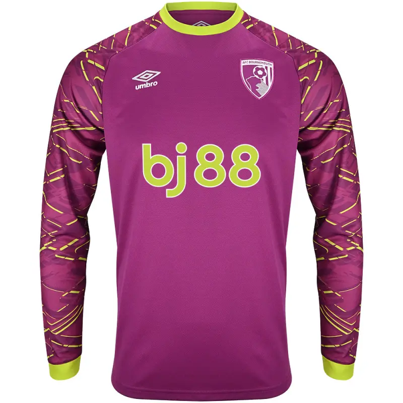 Stand tall in this 25/26 AFC Bournemouth men’s goalkeeper shirt. Crafted in a bold Wild Aster purple colourway with orange trim on the neckline and sleeves, this eye-catching jersey ensures you’ll command attention on the pitch. Featuring long sleeves adorned with an abstract Umbro logo pattern, it’s built to authentic match specifications and finished with a woven full-colour club crest and embroidered Umbro stacked diamond for a premium look.