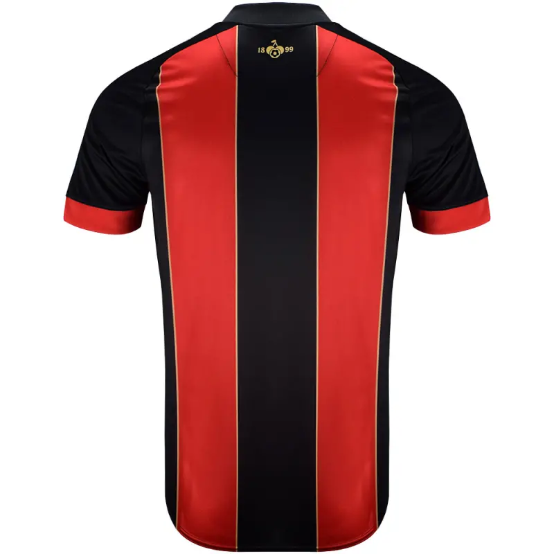 The AFC Bournemouth 2024-25 home shirt celebrates the club’s 125 year anniversary, with a nod to the 10th anniversary of our first promotion to the Premier League. This men’s home shirt features wide red and black stripes, with a subtle gold pinstripe in homage to the 14/15 season kit, and a special 1899-2024 motif on the rear neckline. Made by kit supplier Umbro, the shirt is identical to the shirts worn by the first team players. Finished with the BJ88 sponsors logo alongside a special embroidered Umbro centenary stacked diamond, and woven club crest.