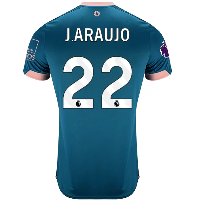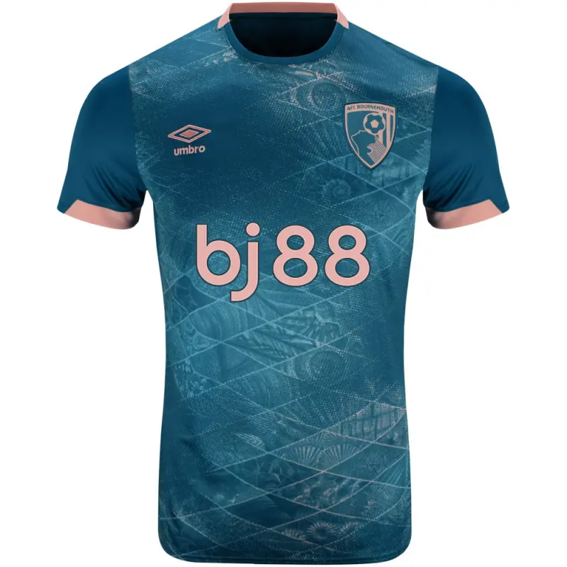 This season’s AFC Bournemouth third kit shirt draws it’s inspiration from our seaside roots – finished in deep lagoon green with an aquatic themed design on the front featuring subtle seashells and waves. The men’s third shirt is identical to the shirts which will be worn by the first team players during the 2024-25 Premier League season. Accented with peach trim on the arms, neckline, club crest and Umbro logo, and finished with the BJ88 sponsor’s logo, and a seashell inspired AFCB print on the rear of the neck.