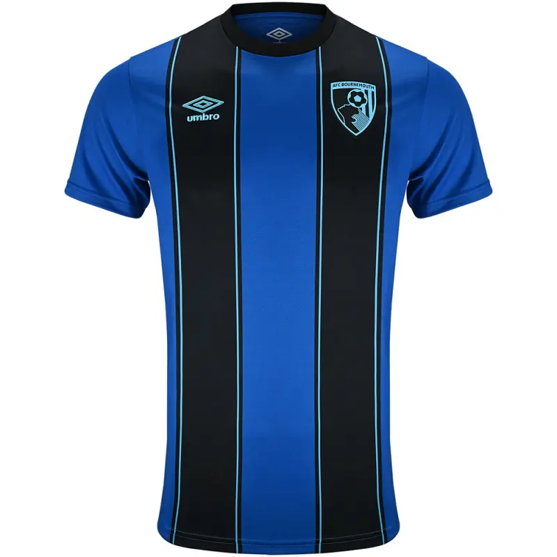 Gear up for the 2025/26 season with the official AFC Bournemouth men’s away shirt, featuring a striking blue and black design inspired by classic kits from the club’s history. This authentic match-specification jersey showcases subtle aqua pinstripe detailing and an embroidered aqua club crest, paired with Umbro’s iconic stacked diamond logo for a premium look. Regular fitting, it offers a comfortable and stylish way to show your support for the Cherries, both on match day and beyond.