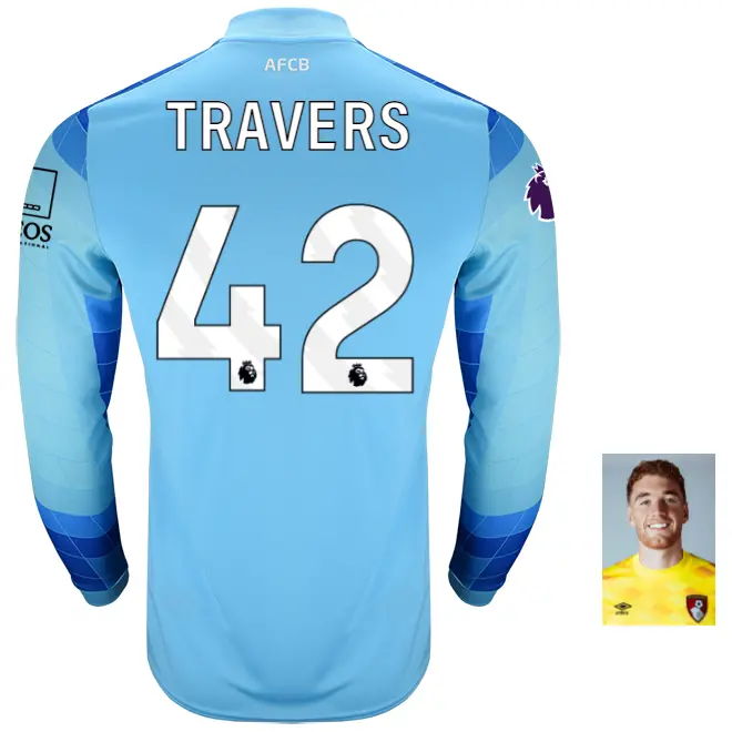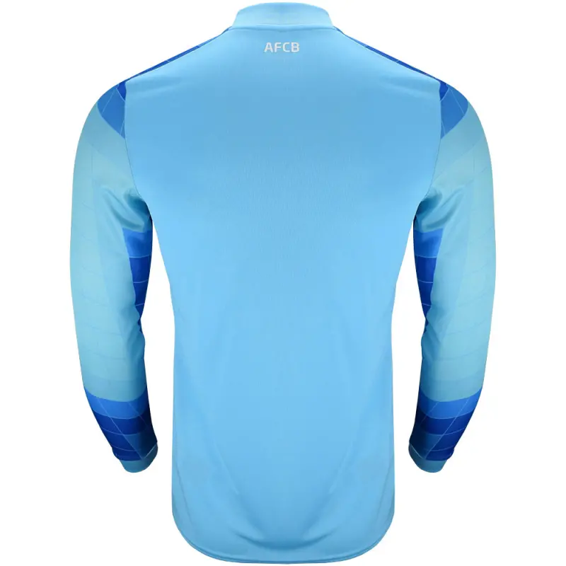 This men’s unsponsored 2024/25 AFC Bournemouth goalkeeper shirt has a bold design, finished in Aquarius Blue, with a tonal diamond zig-zag diamond pattern on the front. The long sleeved top is identical to the jerseys worn by the Cherries’ shot-stoppers this season, and is made from moisture wicking material for comfort, with ribbed collar and cuffs, and AFCB initialling on the rear neckline. Finished with Umbro’s centenary stacked diamond motif, alongside the Cherries embroidered club crest.