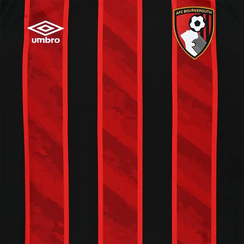 Show your true colours and support AFC Bournemouth in style with the official 25/26 men’s home shirt. The match specification jersey blends performance with passion, featuring striking red and black stripes inspired by ‘rippled sand’ patterns. The gold trim on the sleeves and collar adds a refined edge, while the embroidered club crest and Umbro stacked diamond complete the look.