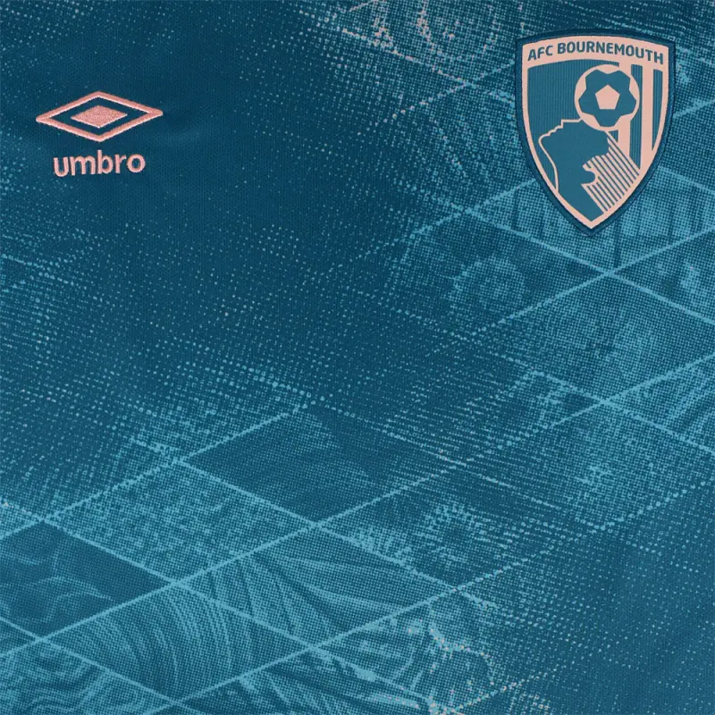 This season’s AFC Bournemouth unsponsored third kit shirt draws it’s inspiration from our seaside roots – finished in deep lagoon green with an aquatic themed design on the front featuring subtle seashells and waves. The men’s third shirt is identical to the shirts which will be worn by the first team players during the 2024-25 Premier League season. Accented with peach trim on the arms, neckline, club crest and Umbro logo, and finished with a seashell inspired AFCB print on the rear of the neck.