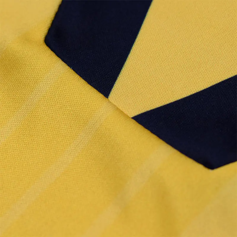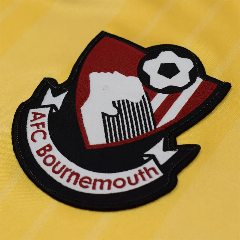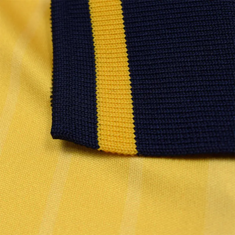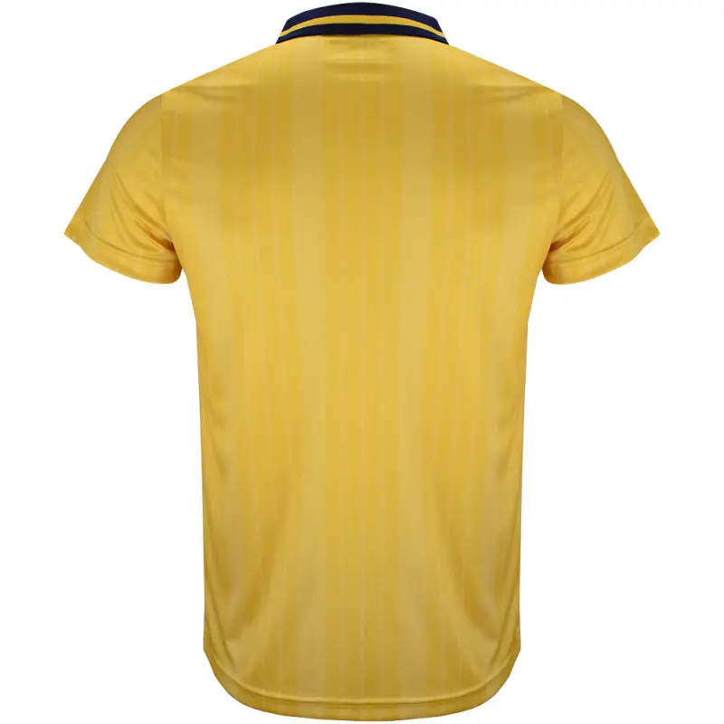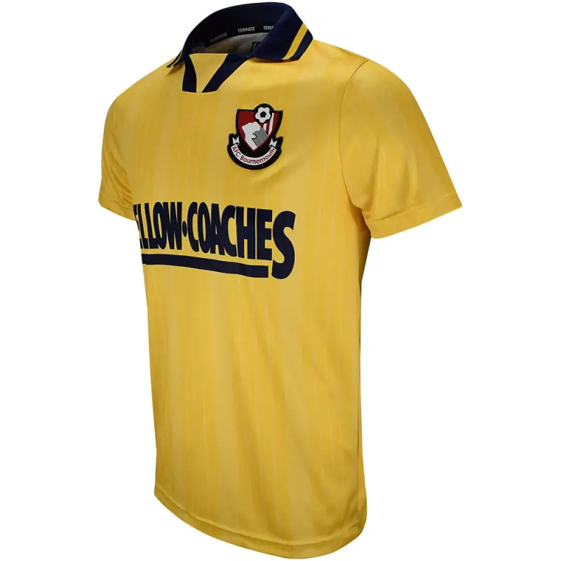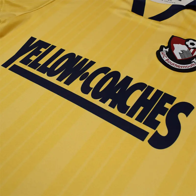 This yellow AFC Bournemouth 95-96 retro away shirt was worn by the Cherries in the Football League second division, and features the iconic Yellow Coaches sponsor. The shirt has a navy trimmed turn-down collar, and bears a subtle stripe design. Finished with the club’s classic crest of the time.