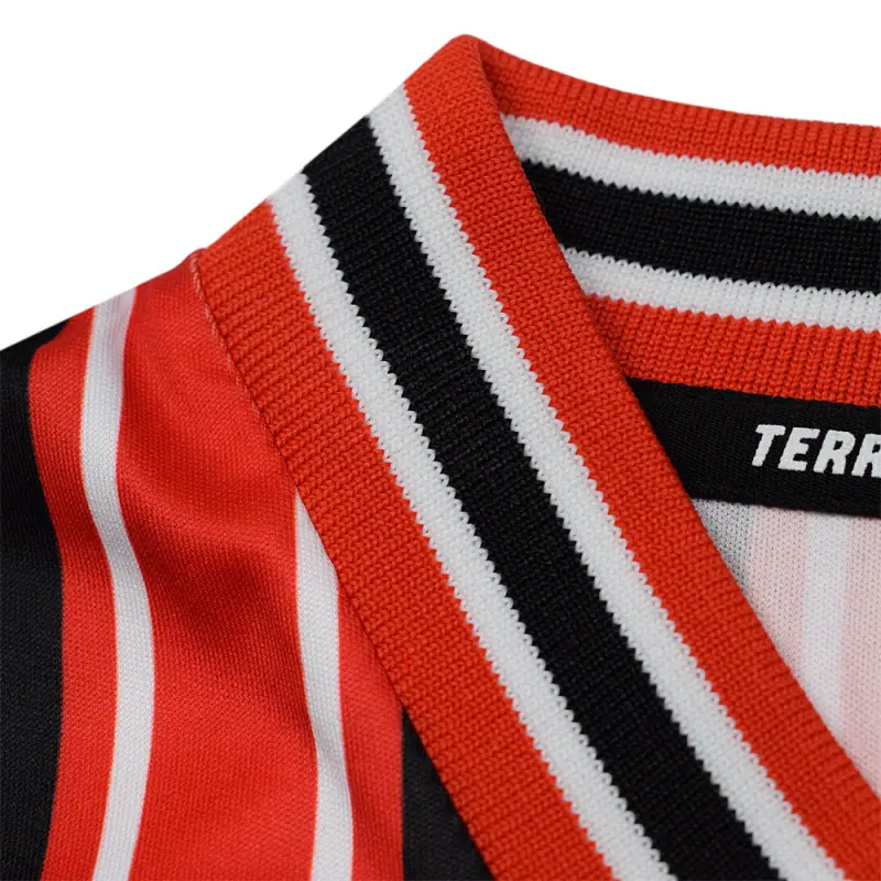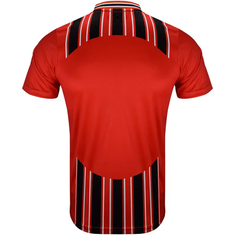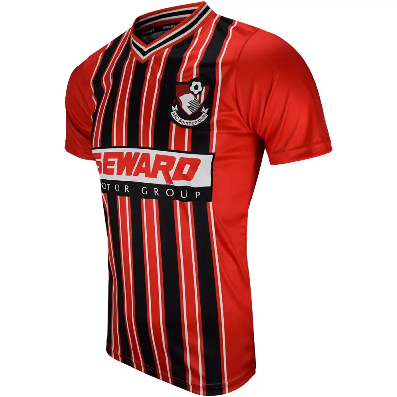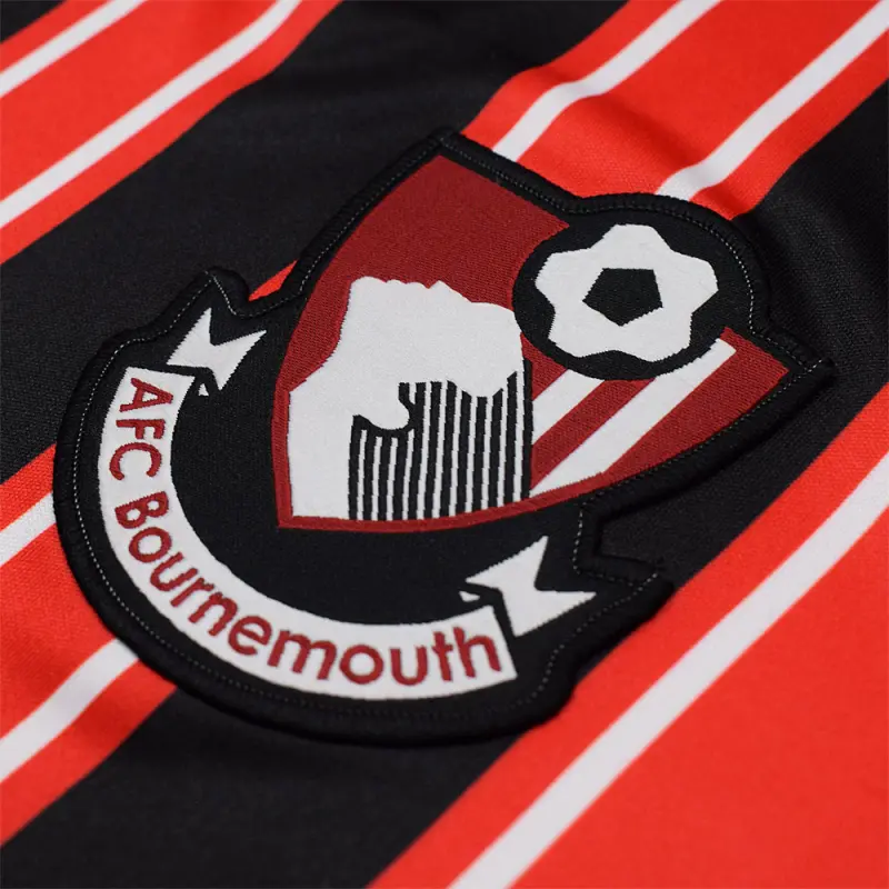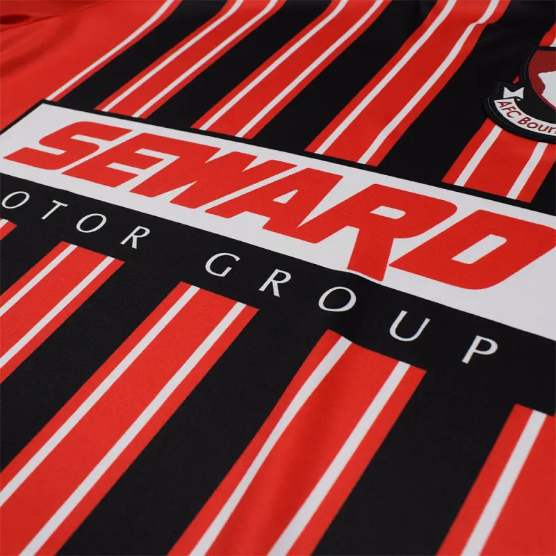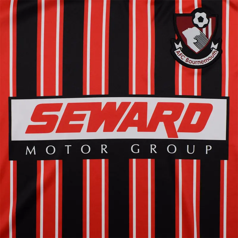This iconic AFC Bournemouth retro shirt is a reproduction of the Cherries home jersey used in the 2000-2001 and 2001-2002 seasons, famously worn by Jermain Defoe – who scored in a then record-equalling 10 game streak on his way to being the club’s top goal scorer in 2000-01. The shirt bears the famous red and black colours with interspersed white pinstripes, and features a v-neck collar. Finished with the season’s Seward sponsor logo and the classic club crest.