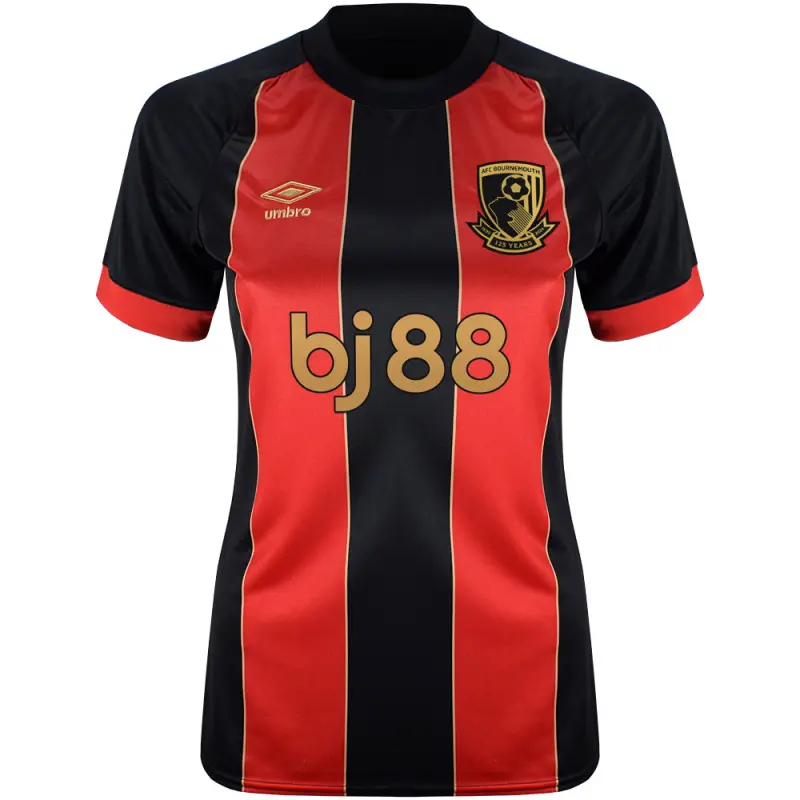 This limited edition version of the AFC Bournemouth 2024-25 home shirt celebrates the club’s 125 year anniversary, with a nod to the 10th anniversary of our first promotion to the Premier League. This women’s home shirt features wide red and black stripes, with a subtle gold pinstripe in homage to the 14/15 season kit, and a special 1899-2024 motif on the rear neckline. Made by kit supplier Umbro, the shirt is specially tailored for women, and is identical to the shirts worn by the first team players. Finished with the BJ88 sponsors logo, alongside a special embroidered Umbro centenary stacked diamond, and our exclusive 125 anniversary edition woven club crest.