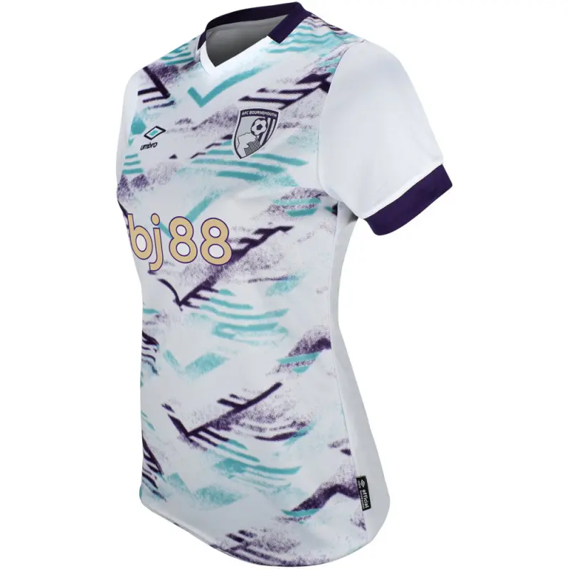 AFC Bournemouth’s away shirt for the 2024-25 Premier League season draw’s it’s inspiration from the famous ‘Pizza Shirt’ worn by the club between 1992-94. Made by kit supplier Umbro, this women’s away shirt features a green and purple chevron design on the front, with pops of purple on the neck and sleeves, and green AFCB initialling on the rear neckline. Specifically tailored for women, the shirt is identical to the jersey which will be worn by the first team players, and is finished with the BJ88 sponsor’s logo, alongside Umbro’s embroidered centenary stacked diamond motif, and the AFC Bournemouth club crest.