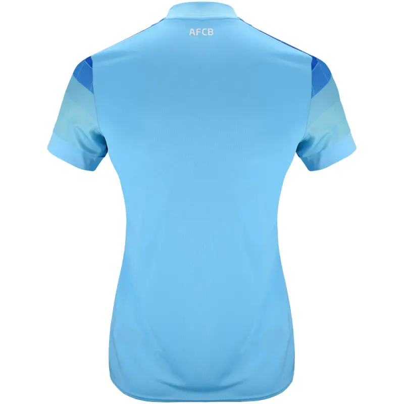 This women’s 2024/25 AFC Bournemouth goalkeeper shirt has a bold design, finished in blue, with a tonal diamond zig-zag pattern on the front, and is tailored specifically for women. The long sleeved top is identical to the jerseys worn by the Cherries’ shot-stoppers this season, and is made from moisture wicking material for comfort, with ribbed collar and cuffs, and AFCB initialling on the rear neckline. Finished with the BJ88 sponsors logo, alongside Umbro’s centenary stacked diamond motif, and the Cherries embroidered club crest.