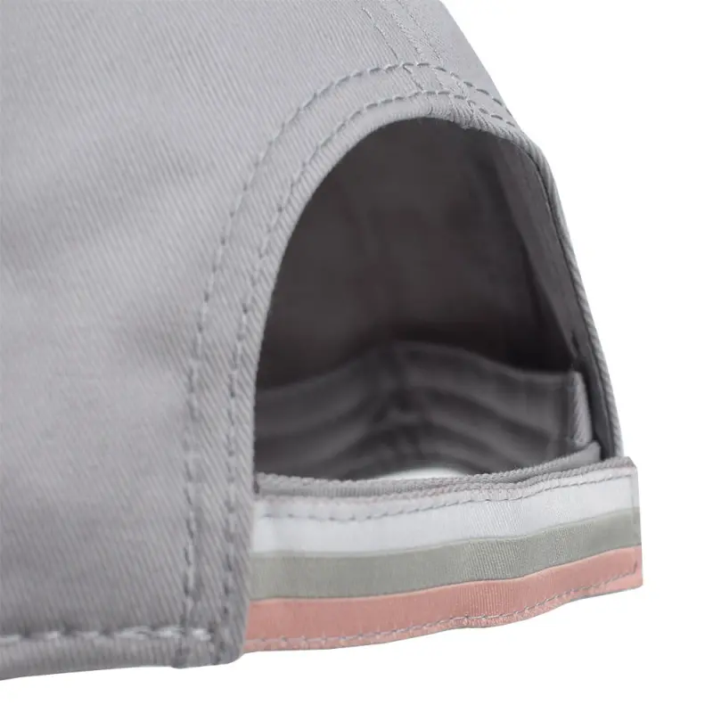 • Contrasting pink embroidery and peak trim
