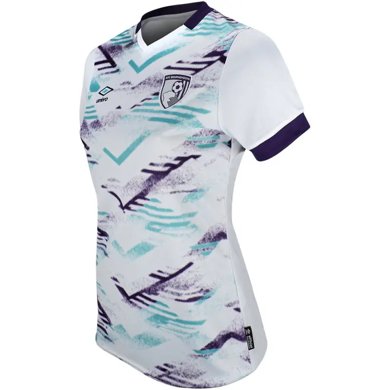 AFC Bournemouth’s away shirt for the 2024-25 Premier League season draw’s it’s inspiration from the famous ‘Pizza Shirt’ worn by the club between 1992-94. Made by kit supplier Umbro, this women’s unsponsored away shirt features a green and purple chevron design on the front, with pops of purple on the neck and sleeves, and green AFCB initialling on the rear neckline. Specifically tailored for women, the shirt is identical to the jersey which will be worn by the first team players, and is finished with Umbro’s embroidered centenary stacked diamond motif, alongside the AFC Bournemouth club crest.