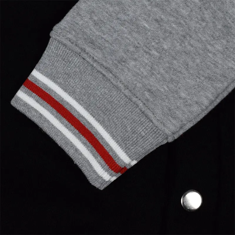 This youth’s black and grey AFC Bournemouth baseball jacket has a classic style perfect for younger supporters, made from premium cotton with a warm fleecy backing. The Cobb baseball jacket is a regular fit, and features a chrome popper fastening, ribbed neck, cuffs and waist with contrasting trim, and grey sleeves with a black hoop detail. Suitable for boys and girls, and finished with a woven club crest on the chest.